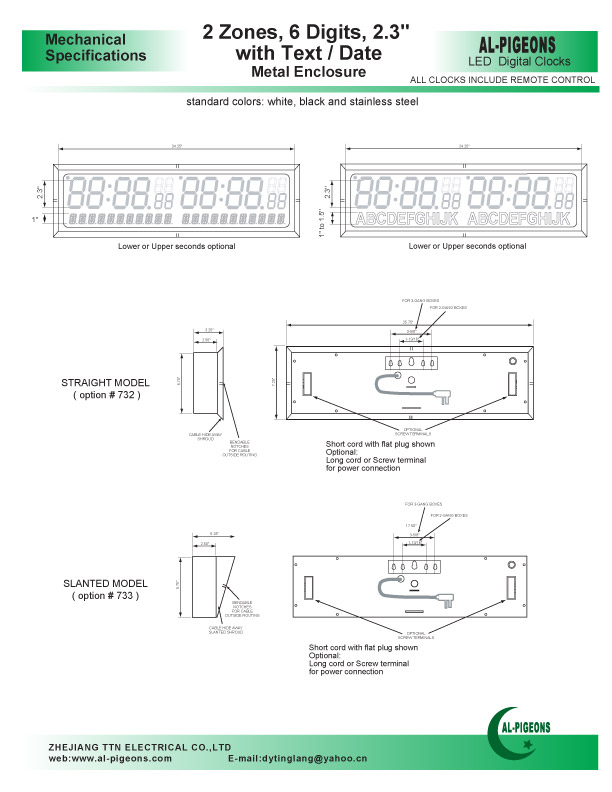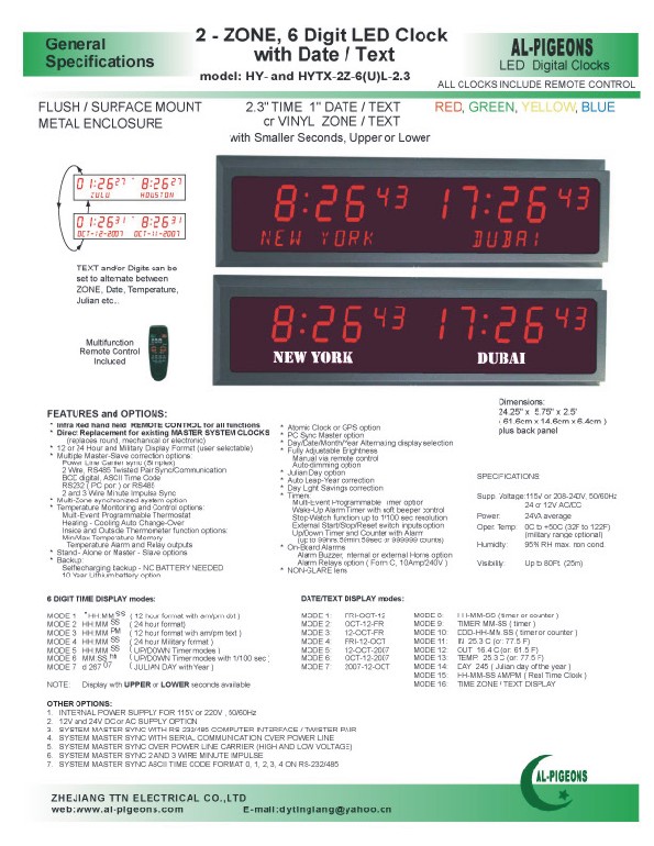 2 - ZONE, 6 Digit LED Clock with Date / Textmodel: HY- and HYTX-2Z-6(U)L-2.3 Multifunction Remote Control Included 2.3" TIME 1" DATE / TEXT or VINYL ZONE / TEXT with Smaller Seconds, Upper or Lower RED, GREEN, YELLOW, BLUE FLUSH / SURFACE MOUNT METAL ENCLOSUREFEATURES and OPTIONS: * Infra Red hand held REMOTE CONTROL for all functions * Direct Replacement for existing MASTER SYSTEM CLOCKS (replaces round, mechanical or electronic) * 12 or 24 Hour and Military Display Format (user selectable) * Multiple Master-Slave correction options: Power Line Carrier sync (Simplex) 2 Wire, RS485 Twisted Pair Sync/Communication BCD digital, ASCII Time Code RS232 ( PC port ) or RS485 2 and 3 Wire Minute Impulse Sync * Multi-Zone synchronized system option * Temperature Monitoring and Control options: Multi-Event Programmable Thermostat Heating - Cooling Auto Change-Over Inside and Outside Thermometer function options: Min/Max Temperature Memory Temperature Alarm and Relay outputs * Stand - Alone or Master - Slave options * Backup: Selfrecharging backup - NO BATTERY NEEDED 10 Year Lithium battery option * Atomic Clock or GPS option * PC Sync Master option * Day/Date/Month/Year Alternating display selection * Fully Adjustable Brightness Manual via remote control Auto-dimming option * Julian Day option * Auto Leap-Year correction * Day Light Savings correction * Timers: Multi-Event Programmable Timer option Wake-Up Alarm Timer with soft beeper control Stop-Watch function up to 1/100 sec resolution External Start/Stop/Reset switch inputs option Up/Down Timer and Counter with Alarm (up to 99hrs:59min:59sec or 999999 counts) * On-Board Alarms: Alarm Buzzer, internal or external Horns option Alarm Relays option ( Form C, 10Amp/240V ) * NON-GLARE lens SPECIFICATIONS: Supp. Voltage:115V or 208-240V, 50/60Hz 24 or 12V AC/DC Power: 24VA average Oper. Temp: 0C to +50C (32F to 122F) (military range optional) Humidity: 95% RH max. non cond. Visibility: Up to 80Ft. (25m)6 DIGIT TIME DISPLAY modes: MODE 1: .HH:MM SS ( 12 hour format with am/pm dot ) MODE 2: HH:MM SS ( 24 hour format) MODE 3: HH:MM PM ( 12 hour format with am/pm text ) MODE 4: HH:MM SS ( 24 hour Military format ) MODE 5: HH:MM SS ( UP/DOWN Timer modes ) MODE 6: MM:SS hh ( UP/DOWN Timer modes with 1/100 sec ) MODE 7: d 267 07 ( JULIAN DAY with Year ) NOTE: Display with UPPER or LOWER seconds available DATE/TEXT DISPLAY modes: MODE 1: FRI-OCT-12 MODE 2: OCT-12-FRI MODE 3: 12-OCT-FRI MODE 4: FRI-12-OCT MODE 5: 12-OCT-2007 MODE 6: OCT-12-2007 MODE 7: 2007-12-OCT MODE 8: HH-MM-SS ( timer or counter ) MODE 9: TIMER MM-SS ( timer ) MODE 10: DDD-HH-MM.SS ( timer or counter ) MODE 11: IN 25.3 C (or: 77.5 F) MODE 12: OUT 16.4 C (or: 61.5 F) MODE 13: TEMP. 25.3 C (or: 77.5 F) MODE 14: DAY 245 ( Julian day of the year ) MODE 15: HH-MM-SS AM/PM ( Real Time Clock ) MODE 16: TIME ZONE / TEXT DISPLAY OTHER OPTIONS: 1. INTERNAL POWER SUPPLY FOR 115V or 220V , 50/60Hz 2. 12V and 24V DC or AC SUPPLY OPTION 3. SYSTEM MASTER SYNC WITH RS-232/485 COMPUTER INTERFACE / TWISTER PAIR 4. SYSTEM MASTER SYNC WITH SERIAL COMMUNICATION OVER POWER LINE 5. SYSTEM MASTER SYNC OVER POWER LINE CARRIER (HIGH AND LOW VOLTAGE) 6. SYSTEM MASTER SYNC 2 AND 3 WIRE MINUTE IMPULSE 7. SYSTEM MASTER SYNC ASCII TIME CODE FORMAT 0, 1, 2, 3, 4 ON RS-232/485 KERA Technologies Inc. www.ledclocks.com E-mail: sales@ledclocks.com ALL CLOCKS INCLUDE REMOTE CONTROL |