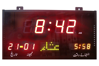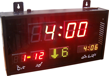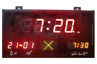 Model: AZ306M Prayer Clock for Masajid and Prayer Halls. Display prayer names in Urdu / Arabic . Includes 10 minute countdown timer at every changeover of prayer time. Available for different Taqweem and Fiqqa. Facility to add specially prepared Salah/Salaat Charts. Also suitable for public places like airports, railway stations, hospitals, malls etc. Features: Displays NEXT Prayer time. Display DATE on separate digits. 16 x 8 dot matrix display to show Prayer names at proper time. Buzzer sound indication at every change of Prayer time. Forbidden Time external Indication interface. Adjustable Ishraq & Zawaal duration. (forbidden prayer time) Adjustable Day Light Saving Remote control setting. Precise Time accuracy. Maximum +/- 2min. per year Wall Mount. Technical Specifications: