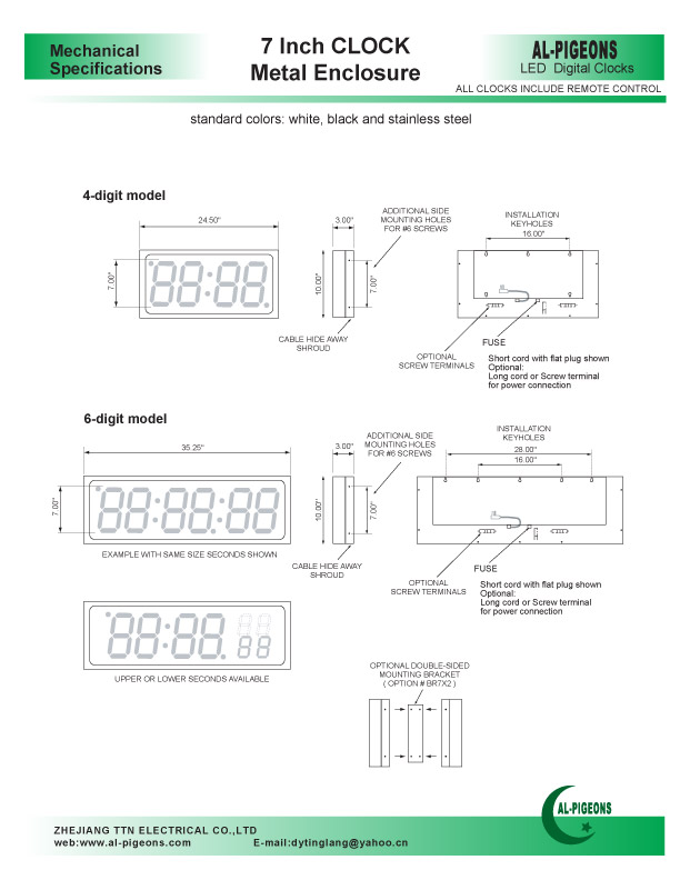 4 and 6 Digit 7" LED Clock Metal and Stainless Steel Enclosures Super Bright LEDs: RED, GREEN, YELLOW or BLUE - 7 INCH High Digits 4 and 6 DIGITSSTANDARD FEATURES: * Infra Red hand held REMOTE CONTROL for all functions * 12 or 24 Hour and Military Display Format (user selectable via remote) * Stand - Alone operation for Home or Office * Backup: Self-recharging backup - NO BATTERY NEEDED * Day/Date/Month/Year Alternating display selection * Fully Adjustable Brightness ( Manual via remote control ) * Julian Day display * Auto Leap-Year correction * Day Light Savings correction ( N. America ) * Timers: Wake-Up Alarm Timer with soft beeper control Stop-Watch function up to 1/100 sec resolution Up/Down Presettable Timer and Counter with Alarm (up to 99hrs:59min:59sec or 999999 counts) Cycling timer, Up and Down * On-Board Alarms: Internal Alarm buzzer * NON-GLARE lens * NON-MULTIPLEXING - Camera friendly * Variety of enclosure colors. Supply Voltage: 115V or 208-240V, 50/60Hz 24 or 12V AC/DC Power: 12VA average Operating Temperature: 0C to +50C (32F to 122F) (military range optional) Humidity: 95% RH max. non cond. 4-digits model Dimensions: 24.5" x 10" x 3" (62.3cm x 25.4 x 7.6cm) 6-digits model Dimensions: 35.25" x 10" x 3" (89.5cm x 25.4cm x 7.6cm) Visibility: Up to 250 Ft. (80m |