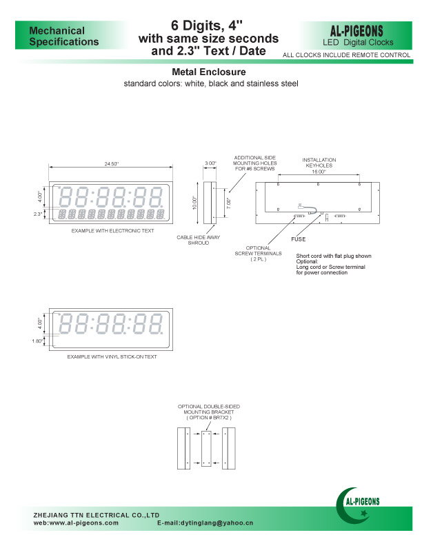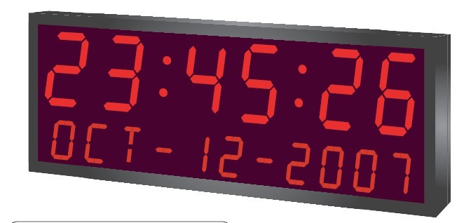 6 Digit Time & Date / Text LED Clock model: HYTX-6S-4 4" TIME, 2.3" DATE / TEXT RED, GREEN, YELLOW, BLUEFLUSH / SURFACE MOUNT METAL ENCLOSURE FEATURES and OPTIONS: * Infra Red hand held REMOTE CONTROL for all functions * Direct Replacement for existing MASTER SYSTEM CLOCKS (replaces round, mechanical or electronic) * 12 or 24 Hour and Military Display Format (user selectable) * Multiple Master-Slave correction optional modes: Power Line Carrier sync (Simplex) 2 Wire, RS485 Twisted Pair Sync/Communication BCD digital, ASCII Time Code RS232 ( PC port ) or RS485 2 and 3 Wire, 24V Minute Impulse Sync * Multi-Zone synchronized system options * Temperature Monitoring and Control options: Multi-Event Programmable Thermostat Heating - Cooling Auto Change-Over Inside and Outside Thermometer function Min/Max Temperature Memory Temperature Alarm and Relay outputs * Stand - Alone or Master - Slave * Backup: Selfrecharging backup - NO BATTERY NEEDED 10 Year Lithium battery option * Atomic Clock or GPS options * PC Sync Master option * Day/Date/Month/Year Alternating display selection * Fully Adjustable Brightness Manual via remote control Auto-dimming option * Julian Day option * Auto Leap-Year correction * Day Light Savings correction * Timers: Multi-Event Programmable Timer option Wake-Up Alarm Timer with soft beeper control Stop-Watch function up to 1/100 sec resolution External Start/Stop/Reset switch inputs option Up/Down Presettable Timer and Counter with Alarm (up to 99hrs:59min:59sec or 999999 counts) * On-Board Alarms: Alarm Buzzer, internal or external optional Horns Alarm Relays options ( Form C, 10Amp/240V ) * NON-GLARE lens 6 DIGIT TIME DISPLAY modes: MODE 1: .HH:MM:SS ( 12 hour format with am/pm dot ) MODE 2: HH:MM:SS ( 24 hour format) MODE 3: HH:MM PM ( 12 hour format with am/pm text ) MODE 4: HH:MM:SS ( 24 hour Military format ) MODE 5: HH:MM:SS ( UP/DOWN Timer modes ) MODE 6: MM:SS:hh ( UP/DOWN Timer modes with 1/100 sec ) MODE 7: d 267 07 ( JULIAN DAY with Year ) DATE/TEXT DISPLAY modes: MODE 1: FRI-OCT-12 MODE 2: OCT-12-FRI MODE 3: 12-OCT-FRI MODE 4: FRI-12-OCT MODE 5: 12-OCT-2007 MODE 6: OCT-12-2007 MODE 7: 2007-12-OCT MODE 8: HH-MM-SS ( timer or counter ) MODE 9: TIMER MM-SS ( timer ) MODE 10: DDD-HH-MM.SS ( timer or counter ) MODE 11: IN 25.3 C (or: 77.5 F) MODE 12: OUT 16.4 C (or: 61.5 F) MODE 13: TEMP. 25.3 C (or: 77.5 F) MODE 14: DAY 245 ( Julian day of the year ) MODE 15: HH-MM-SS AM/PM ( Real Time Clock ) MODE 16: TIME ZONE / TEXT DISPLAY OTHER OPTIONS: 1. INTERNAL POWER SUPPLY FOR 115V or 220V , 50/60Hz 2. 12V and 24V DC or AC SUPPLY OPTION 3. SYSTEM MASTER SYNC WITH RS-232/485 COMPUTER INTERFACE / TWISTER PAIR 4. SYSTEM MASTER SYNC WITH SERIAL COMMUNICATION OVER POWER LINE 5. SYSTEM MASTER SYNC OVER POWER LINE CARRIER (HIGH AND LOW VOLTAGE) 6. SYSTEM MASTER SYNC 2 AND 3 WIRE, 24 VOLT MINUTE IMPULSE 7. SYSTEM MASTER SYNC ASCII TIME CODE FORMAT 0, 1, 2, 3, 4 ON RS-232/485 |