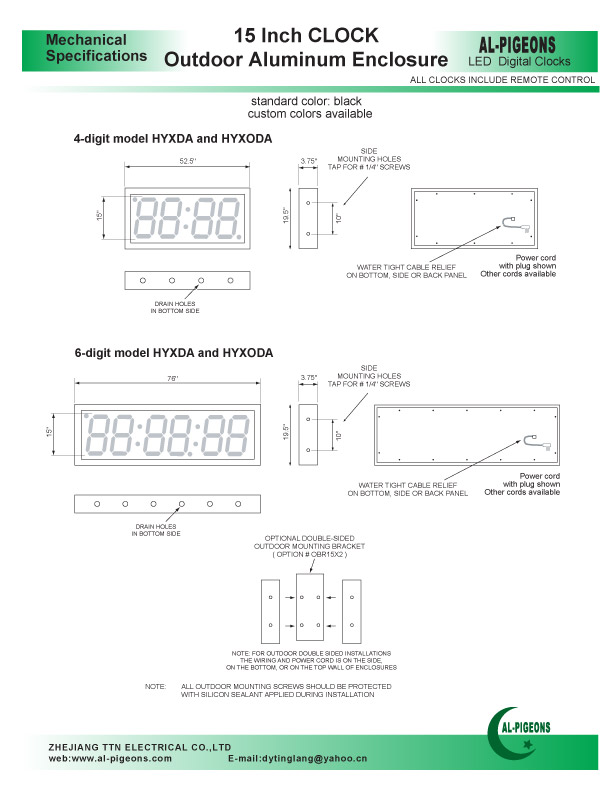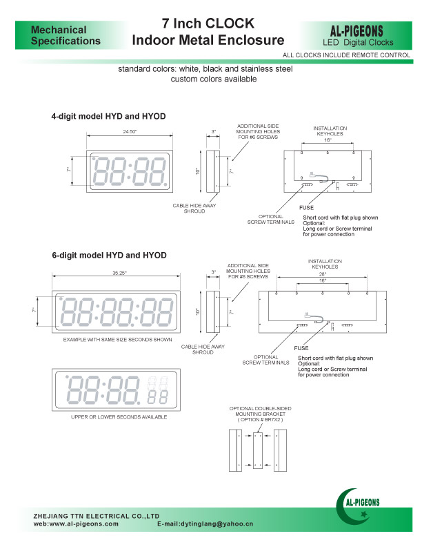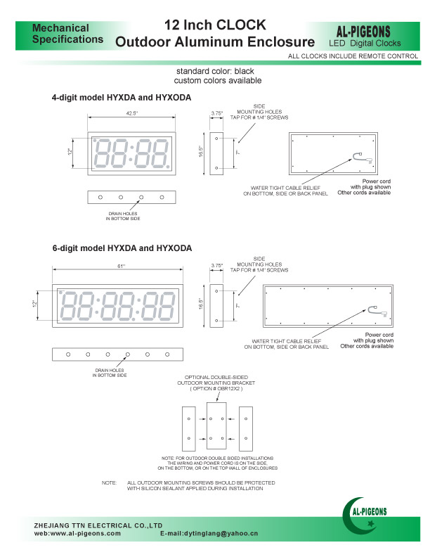 4 and 6 Digit, 7", 12", 15" DOT MATRIX LED Clockmodel series: HYD-4-7 (or 12,15) and HYD-6-7 (or 12,15) in Indoor enclosures and with INDOOR BRIGHTNESS LEDs model series: HYXDA-4-7(or 12,15) and HYXDA-6-7 (or 12,15)in Outoor enclosures and with INDOOR BRIGHTNESS LEDs model series: HYOD-4-7 (or 12,15) and HYOD-6-7 (or 12,15) in Indoor enclosures and with OUTDOOR BRIGHTNESS LEDs model series: HYXODA-4-7 (or 12,15) and HYXODA-6-7 (or 12,15) in Outdoor enclosures and with OUTDOOR BRIGHTNESS LEDsRED, GREEN, YELLOW or BLUE - 7, 12 and 15 INCH High Digits 4 and 6 Digit, 7", 12", 15" DOT MATRIX LED Clock Metal, Steel, Aluminum and Stainless Steel EnclosuresSTANDARD FEATURES: * Infra Red hand held REMOTE CONTROL for all functions * 12 or 24 Hour and Military Display Format (user selectable via remote) * Stand - Alone operation for Home or Office * Backup: Self-recharging backup - NO BATTERY NEEDED * Day/Date/Month/Year Alternating display selection * Fully Adjustable Brightness ( Manual via remote control ) * Julian Day display * Auto Leap-Year correction * Day Light Savings correction ( N. America ) * Timers: Wake-Up Alarm Timer with soft beeper control Stop-Watch function up to 1/100 sec resolution Up/Down Presettable Timer and Counter with Alarm (up to 99hrs:59min:59sec or 999999 counts) Cycling timer, Up and Down * On-Board Alarms: Internal Alarm buzzer * NON-GLARE lens * NON-MULTIPLEXING - Camera friendly * Variety of enclosure colors. Supply Voltage: 115V or 208-240V, 50/60Hz 24 or 12V AC/DC Power: 12VA to 18VA average Operating Temperature: -20C to +70C (-4F to +158F) (military range optional) Humidity: 95% RH max. non cond. Visibility: Up to 250 Ft. (80m |