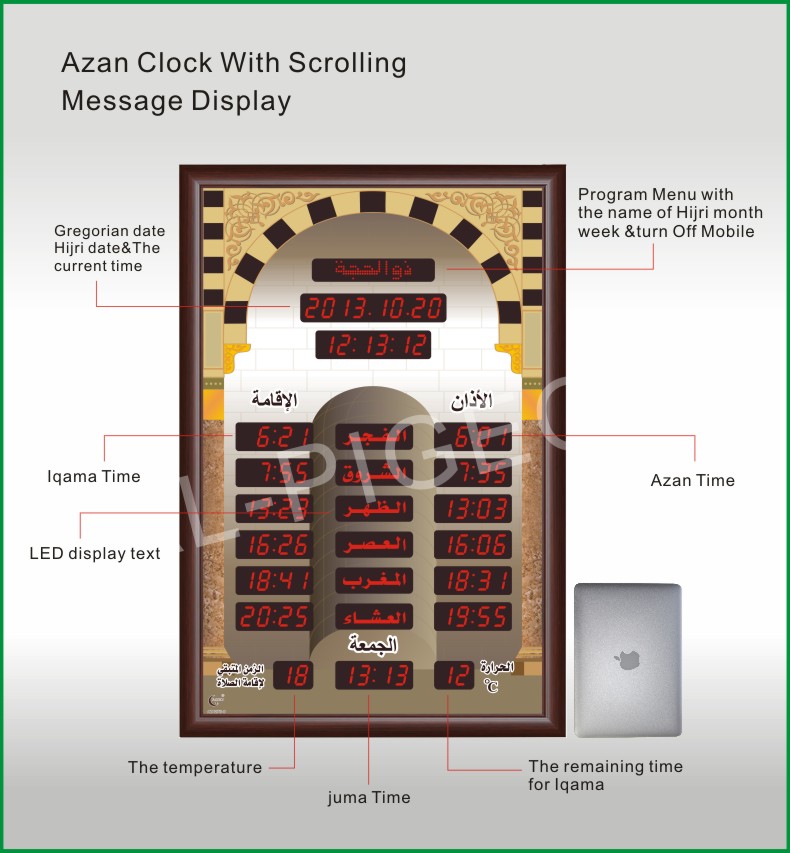 can be configured to display the authorized prayer times in the cities and villages all over the world.